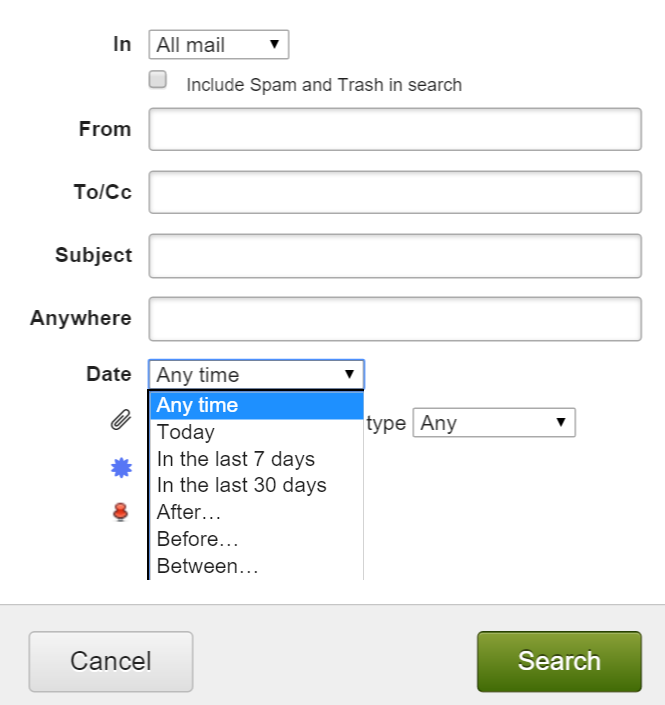 Perhaps you are interested in finding all emails sent in the last month, or the last week? Create time-based searches by clicking on Search/Advanced Search and in the Date dropdown, select ‘last 7 days’ or ‘last 30 days’.