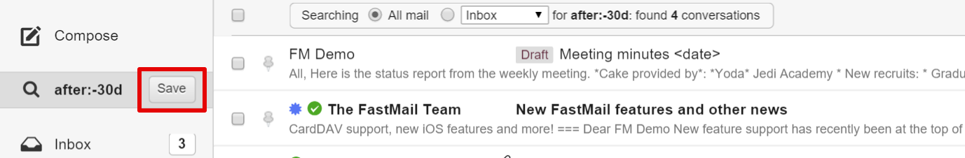 A time-based saved search doesn’t just return the same set of messages: it is dynamic and will always stay current, showing you the last week or month worth of email. (Not the last week worth of email from the day you made the search).
