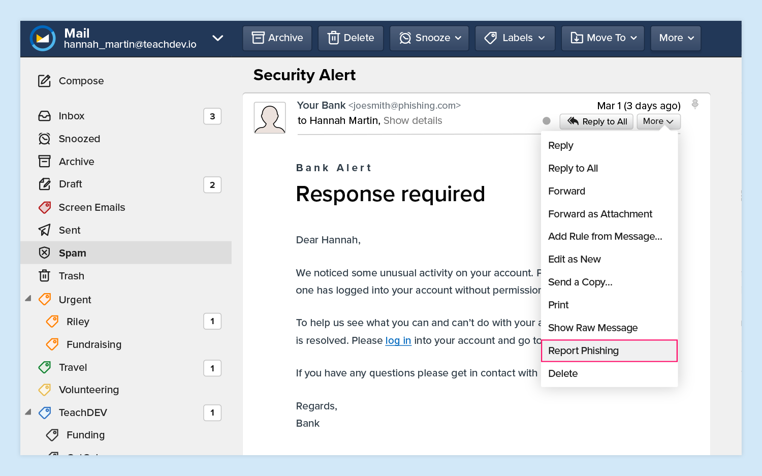 - Report it to your email provider. In Fastmail, you can use our ‘report phishing’ functionality, but all providers offer ‘mark spam’. When enough people report an email as spam, the information makes its way back to the sender’s email host who, if they don’t take action to stop the flow of spam, will find that no other mail provider will receive the mail they send out.