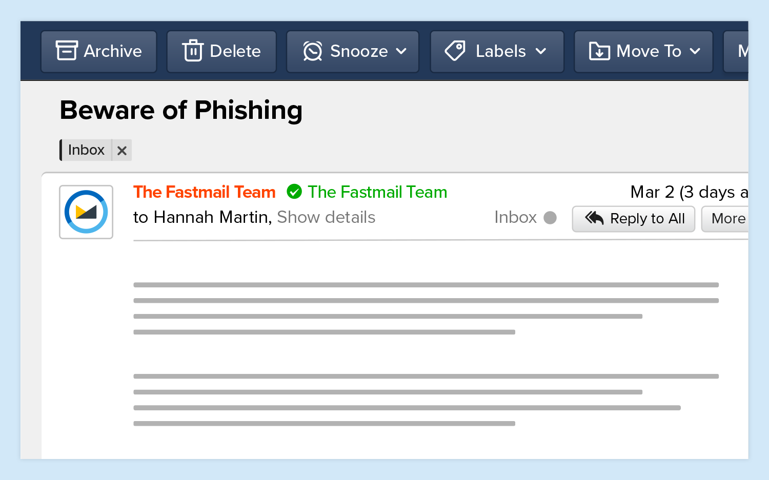 ”Imitation is the sincerest form of flattery”, or so they say. Fastmail is not immune from phishers trying to trick you into giving them your password by impersonating us and getting you to click on a link in their email.