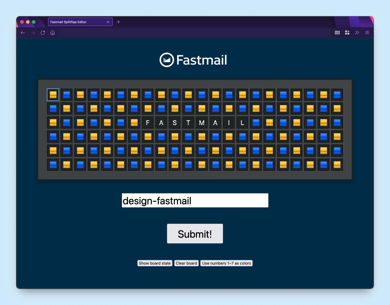 The first problem we tackled was creating a way for Fastmail team members to use the Vestaboard easily.