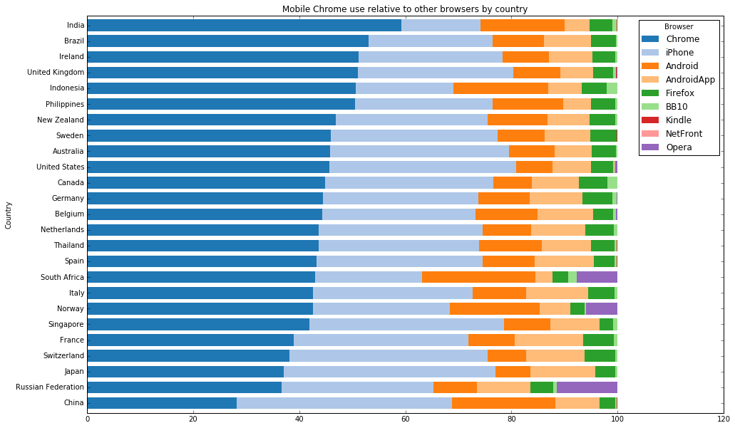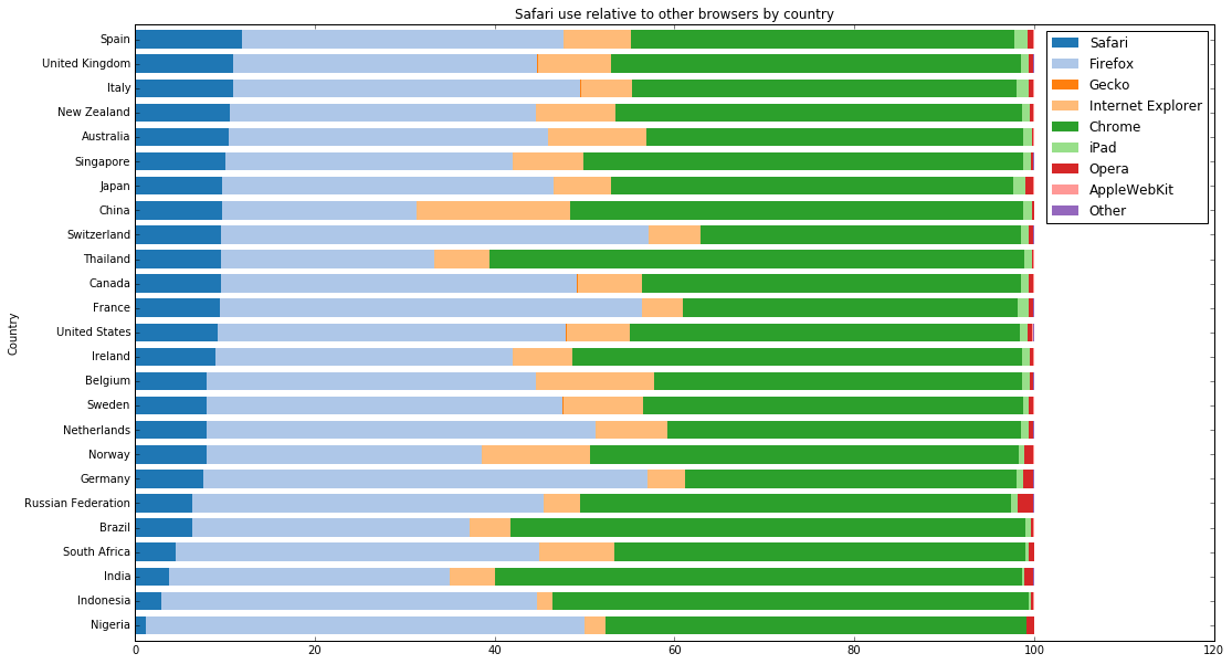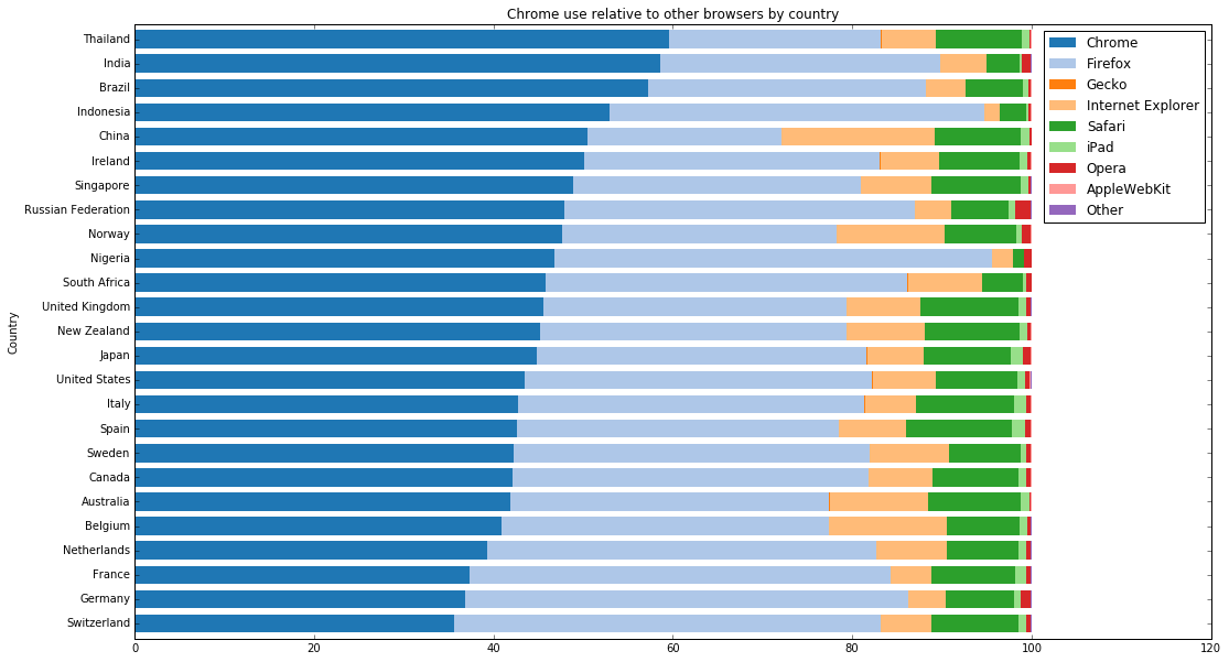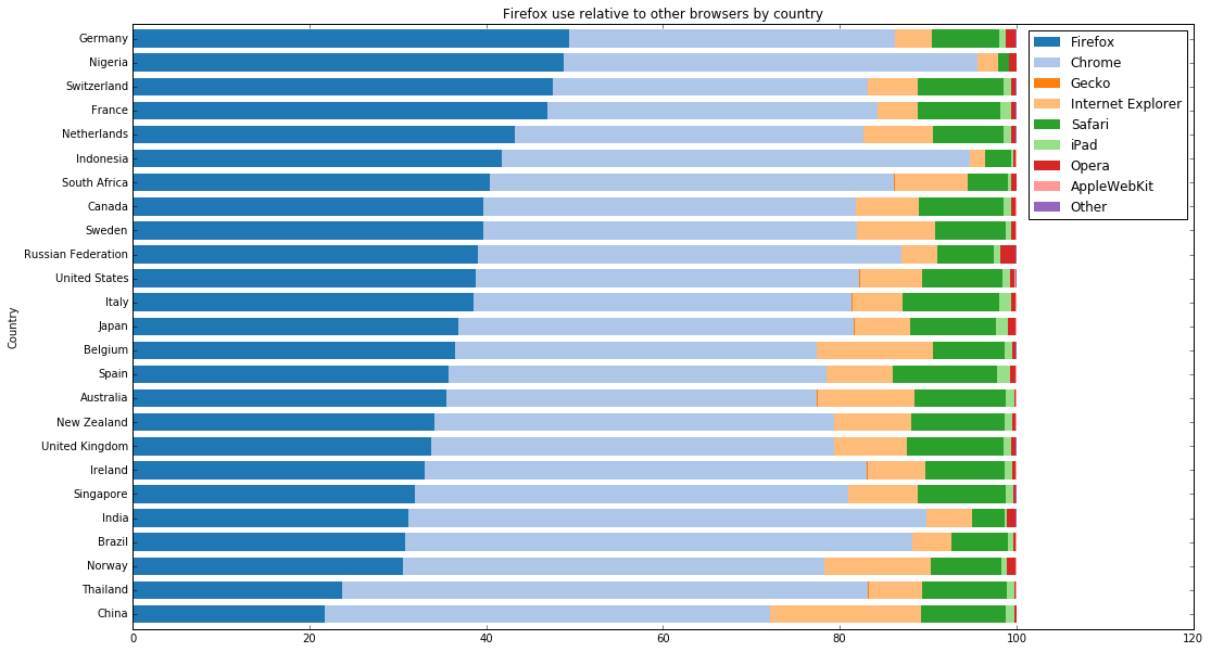 Let’s get the midly technical information out of the way first… the graphs show the percentage breakdown between browsers within each country. The list of countries is the same across each graph and is limited to the top 25 countries by overall user access. Countries are determined by MaxMind GeoIP.