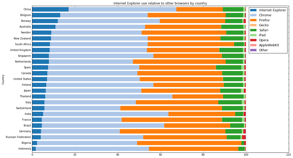 When we focus on Internet Explorer we see China leading the way, with Belgium and Norway perhaps unexpectedly towards the top of the list.