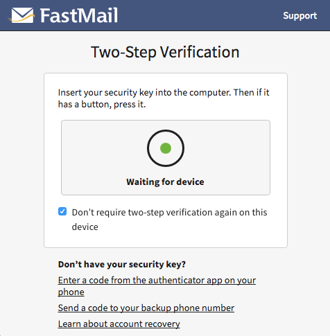 Using a Yubico OTP security key with FastMail is simple, and in fact works exactly the same as with U2F keys. You just plug it into your computer when prompted and press the button on the top.