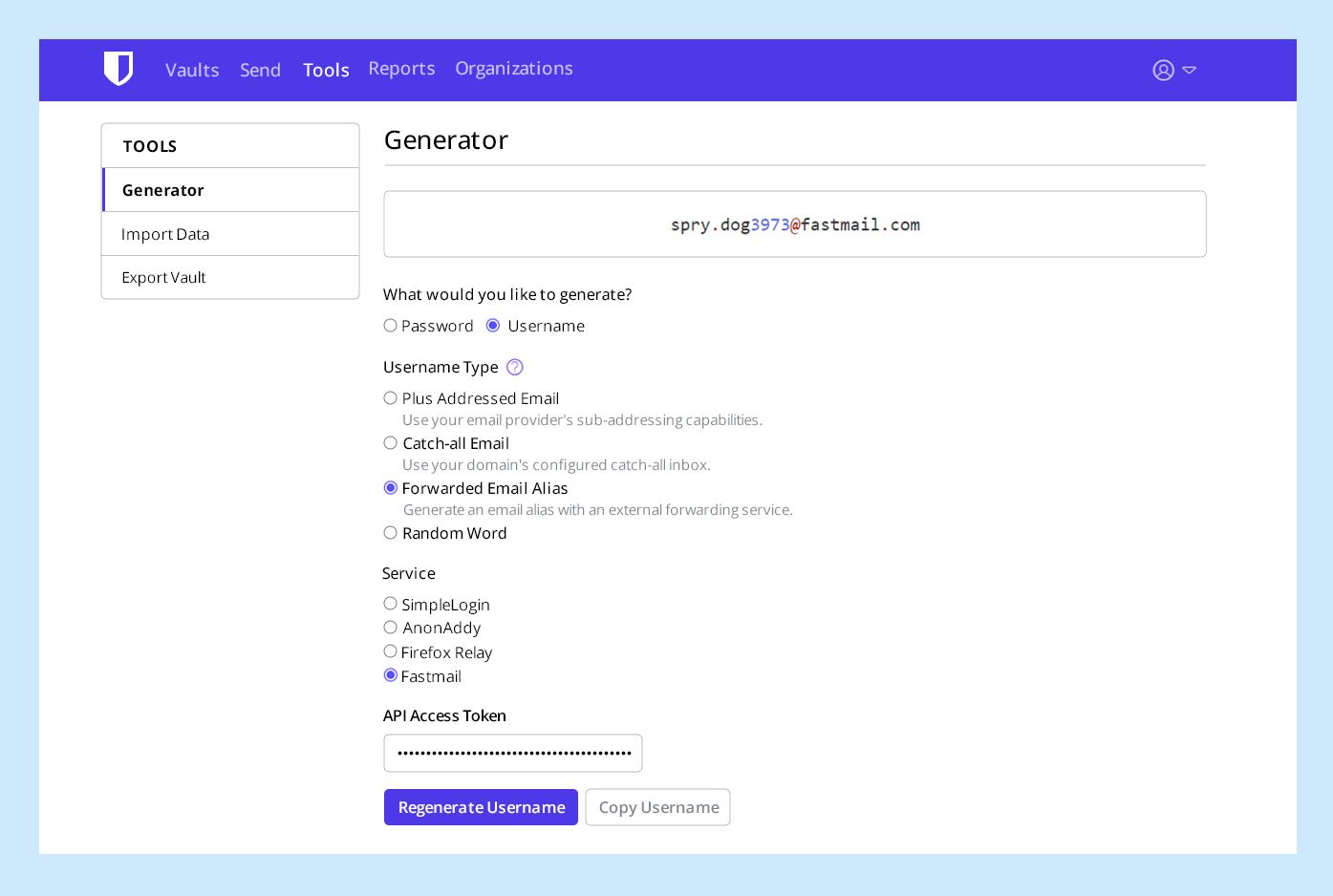 You will need to connect your Fastmail account to Bitwarden by creating an API token in Fastmail. Once this has been done, you can begin generating Masked Email addresses in Bitwarden. The Masked Email addresses will automatically be saved in your Fastmail account. For more detailed steps on connecting your account, check out our help page.