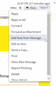 You can also create a rule from your email, based on the current message, using the More button, and then selecting the Add Rule from Message… option from the dropdown menu.