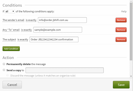 You’ll then see the three sections: Discard, Forward and Organise. When you discard, forward or organise your mail, you create a rule that only applies to messages which match a set of conditions.