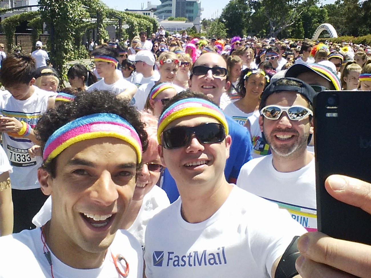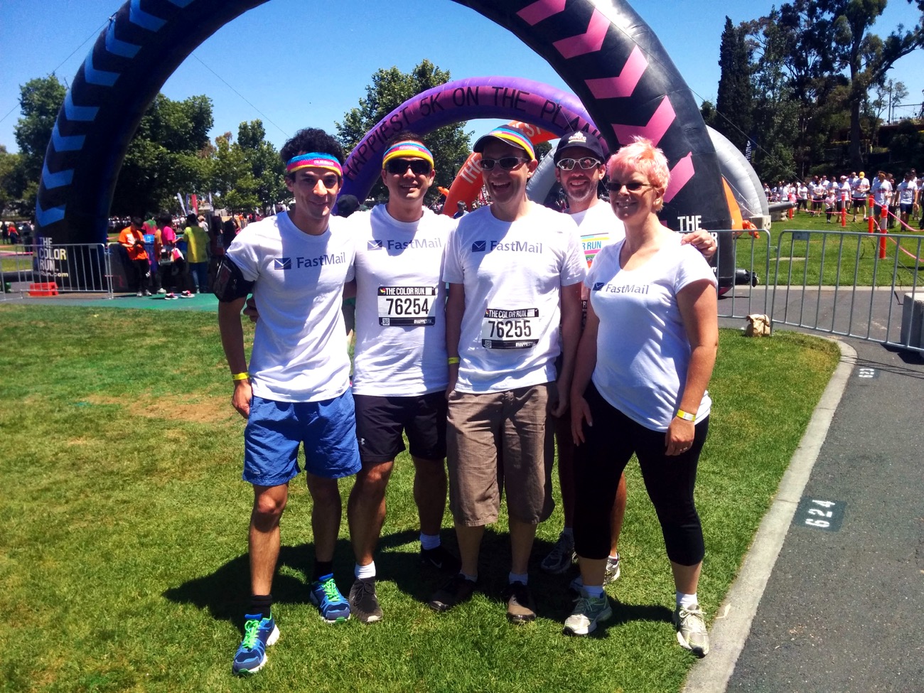 Three weeks ago Team FastMail took part in our first Colour Run. Being based in Melbourne means our summer occurs when most of the world is having winter, and we thought this would be a great opportunity to drag some of the team out of the office and in to the fresh – well, coloured – air.