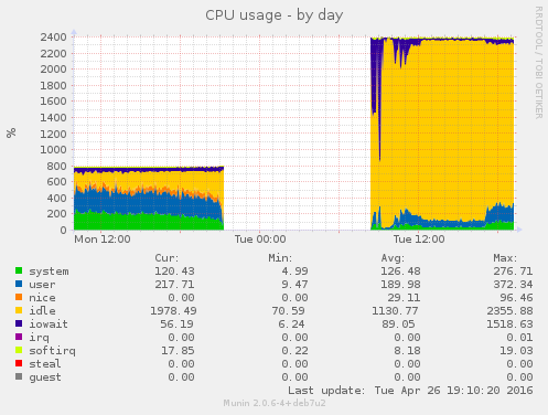 Then I asked the remote hands staff at the datacentre to replace the CPUs, and now we’re getting full use of the IO capacity of the excellent Intel DC-3700 SSDs in these machines.