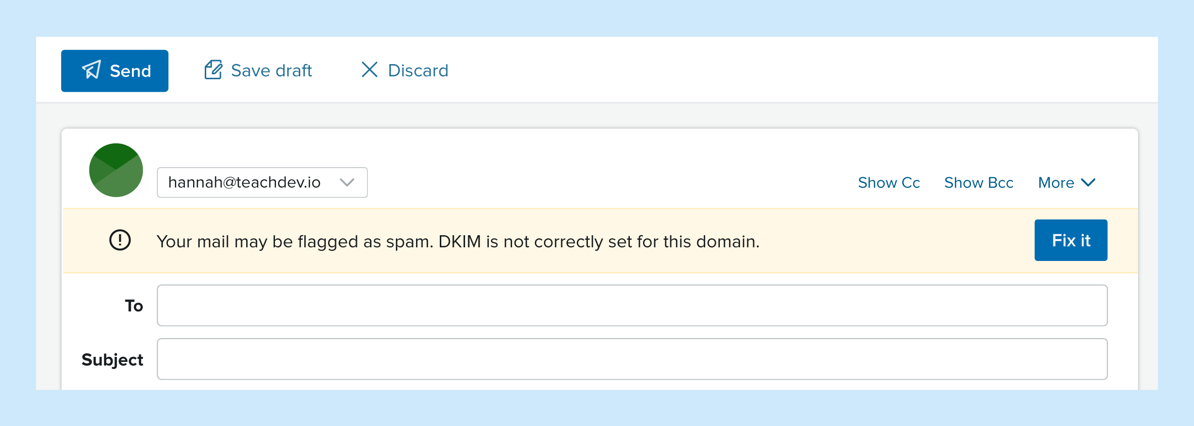 We’ve made some changes to our product to make it easier to see if you’re affected by this. You’ll be able to see if your custom domain needs any DNS records to be changed or added. Making these changes will decrease the likelihood that email you send will go to the recipient’s Spam folder.